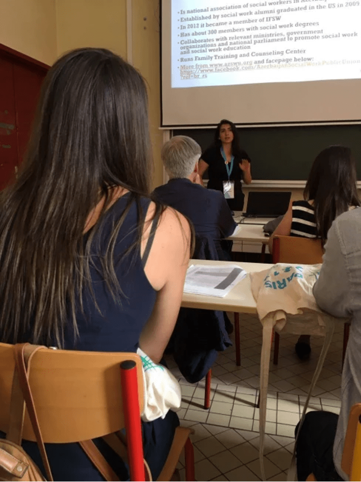 The Executive Director of AZSIIB presented at the Paris Conference on “Social Work Education in Europe: Challenges and Obstacles” organised by the European Association of Social Work Schools and the National Association for Social Work Education and Research in France, with UNESCO’s support. The conference took place from June 27-29, 2017, with over 300 delegates from 40+ countries and representatives from 100 Schools of Social Work attending. Renowned specialists and professors shared their expertise in plenary and parallel sessions covering topics like perspectives in social work education, curriculum development, ethics, and structural aspects of the profession. AZSIIB’s Executive Director, Lamiya Rzayeva, presented on “Social Work Education in the South Caucasus: The Case of Azerbaijan” during the conference.